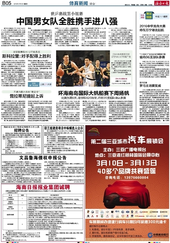 海南日报 体育新闻综合 013 2016-03-031 2016年03月03日 星期四
