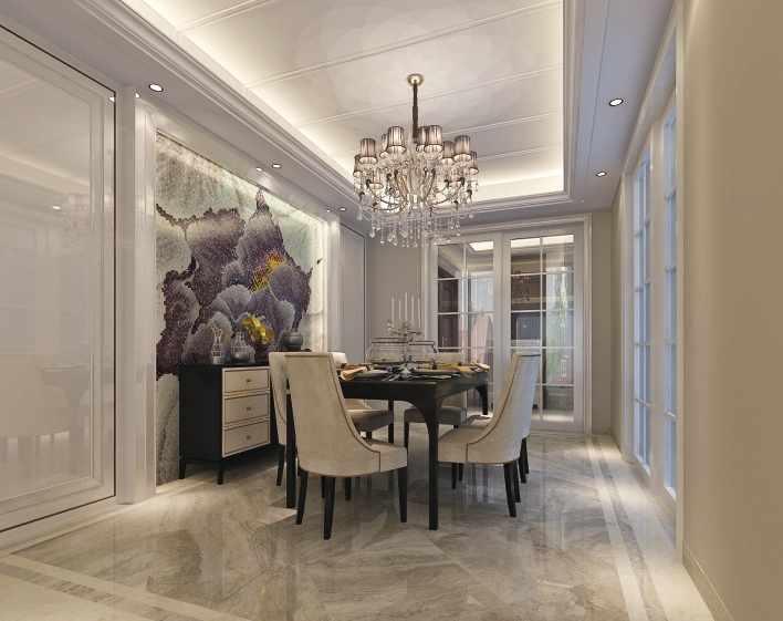 设计说明:客厅线条简洁流畅,淡灰色的瓷砖搭配白色的天花吊顶,给人一尘不染的通透感,以白色为基调打造出多样灵动空间。大气的大理石电视背景墙、马赛克的餐厅背景墙、烤漆板的沙发背景等加以点缀,让奢华的气息优雅地流淌在现代欧式中。