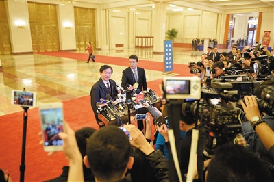 今年,位于人民大会堂北侧的部长通道依然受到记者热捧。记者发现,在部长们接受采访的话筒台上面,除了电台、电视台的话筒外,还有一个鲜明的特点就是新媒体话筒多,比方说新华社客户端和人民日报客户端的话筒都放在了非常显眼的位置。