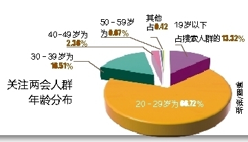数据表明,20-39岁中青年群体对两会的关注度最高,占总搜索人群的八成以上。这也与这一年龄段是上网主要人群的统计相一致。