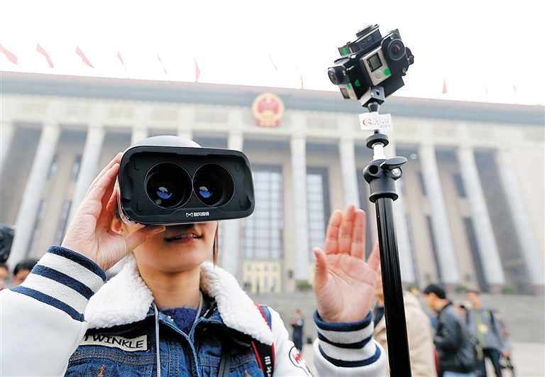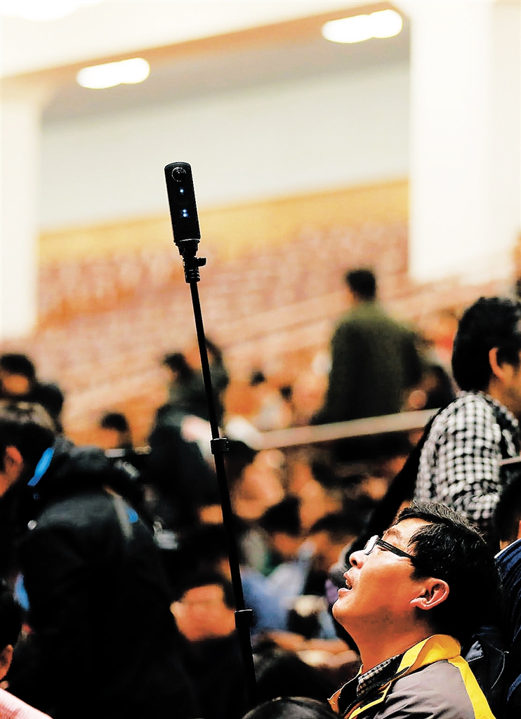 会场内外,媒体单位纷纷加快融合步伐,推行全媒体报道方式。不少媒体利用VR全景摄像机等新设备,对会场内外进行360度全方位摄制,并通过手机客户端、网站等网络平台,向广大受众进行即时报道。这些新科技的“靓丽”身影,成为今年两会报道现场的一道新风景线。本报特派记者 张杰 摄