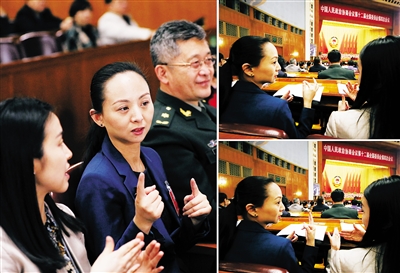 政协委员邰丽华通过翻译的手语“聆听”会议。