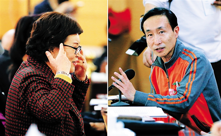 3月4日,全国政协十二届四次会议举行小组讨论。政协委员巩汉林(右)提问。政协委员刘兰芳(左)回应。 本组图片新华社发