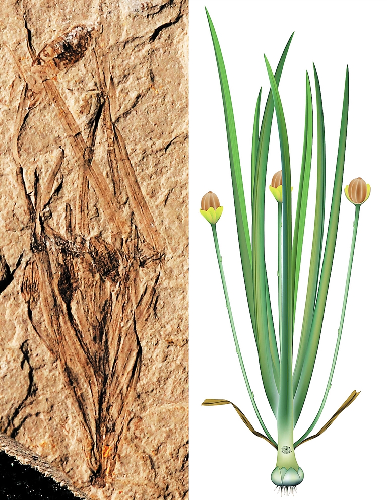 拼版照片:左图是中侏罗世的渤大侏罗草化石,右图是渤大侏罗草的复原图。 1.64亿年前中侏罗世地层中的一种草本植物化石被我国科学家发现,这个目前世界上已知最早的草本被子植物的发现,促使人们重新审视前人提出的被子植物演化观。 新华社发