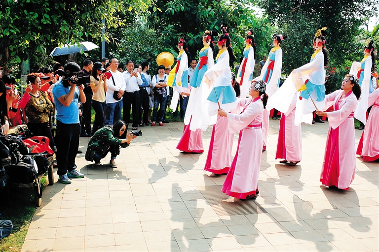 3月8日,“环游海南岛——全球首条环岛高铁中国重点网媒体验行”大型采访活动走进临高县,图为采访团在欣赏临高特有的渔歌“哩哩美”和木偶戏。