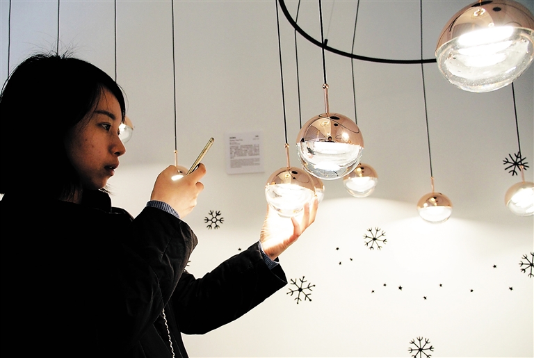 3月9日,观众在观看中国设计师的作品“溜溜球灯”。 当日,汇聚全球顶尖设计品牌和设计师数千件最新作品的亚洲设计盛会——“设计上海 2016”,在上海展览中心开幕。 新华社记者 任珑 摄