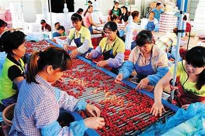3月9日,在定安县定城镇潭黎村圣女果收购点,工人正在筛选优质圣女果,打包装箱运往北京、上海等市场。目前仅定城镇潭黎村就有20多个内地客商收购点,平均每天收购、运输圣女果10万斤。本报记者 张茂 通讯员 王聘钊 摄