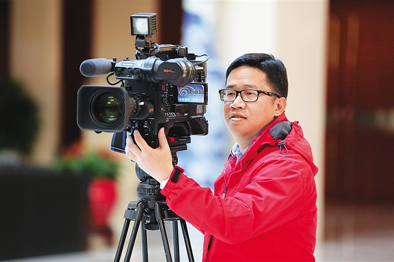 南海网首席摄像李庆芳在全国两会报道现场抓拍画面。海报集团全媒体中心特派记者 冯程 摄