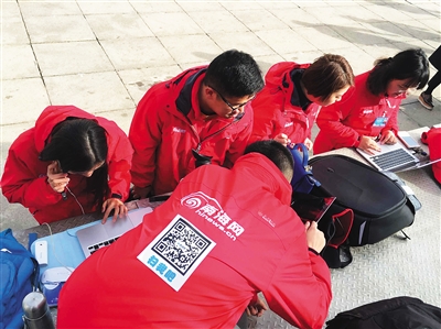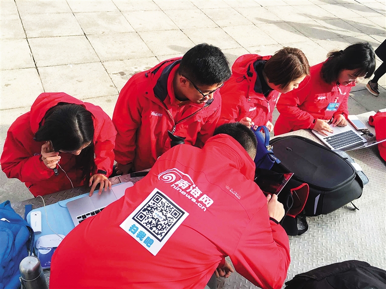 南海网视频记者在全国两会会场外剪辑发送视频新闻。本报特派记者 王凯 摄