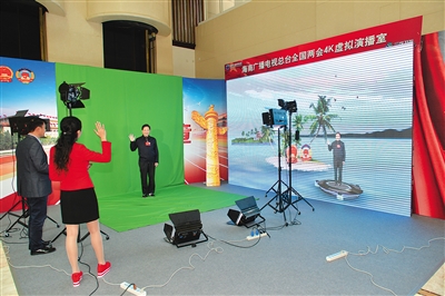 海南广播电视总台把虚拟演播室搬到了会议住地。 本报特派记者 王凯 摄