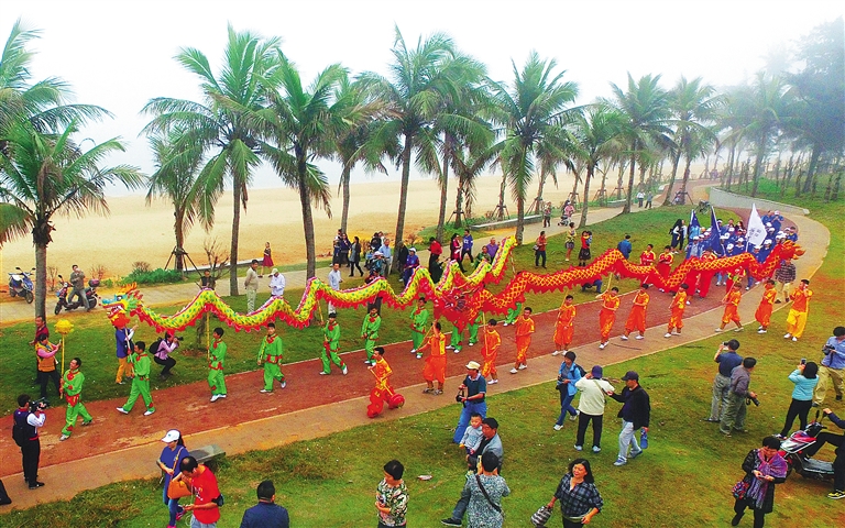 3月10日,今天是我国农历二月初二。民间有二月二龙抬头祭海舞龙祈福来年风调雨顺的习俗。图为海口假日海滩管理公司在西海岸带状公园及海滩等地举行“热爱海洋,保护环境”为主题的舞龙巡游活动。本报记者 古月 摄