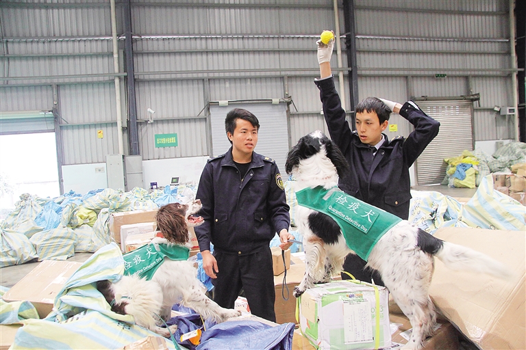 3月11日,在双流国际快件中心大厅内,训犬员在检疫犬工作间隙给它们玩网球,以便其更好工作。 近日,刚刚通过国家质检总局考核的两只检疫犬“九九”、“花豹”在四川检验检疫局双流国际快件中心正式上岗服役,这是全国首批专门针对查验国际邮件和快件的“国门新卫士”。新华社发