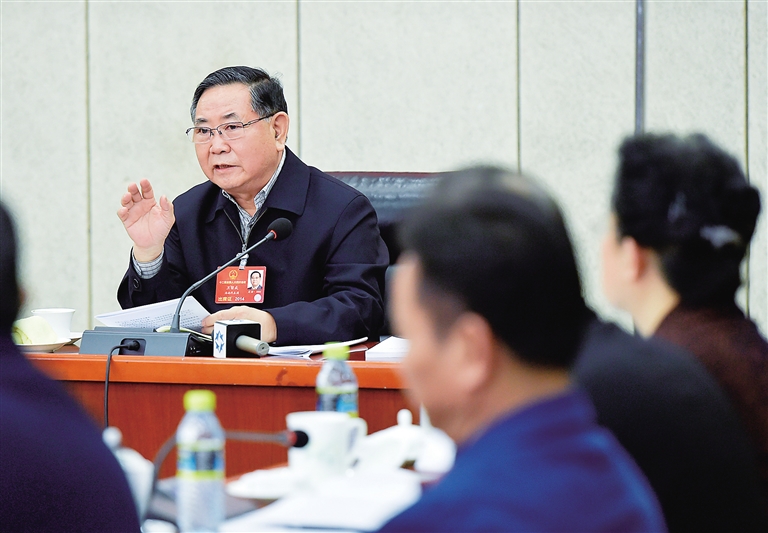3月10日,海南团代表在住地审议全国人大常委会工作报告。代表们围绕报告畅谈体会,并就加强环保立法、强化对立法的监督评估工作、完善城市综合执法法律保障等问题,提出了意见和建议。图为卫留成代表发言。