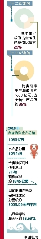 2015年,我省向“海洋强省”之路迈出了坚实的步伐。数据显示,这一年,我省海洋生产总值达1050亿元,“十二五”期间年均增长13%;水产品总量204万吨,“十二五”期间年均增长5%;全省确权海域使用项目71宗,确权面积约1845公顷;划定的海洋生态保护红线区总面积约3009.09平方千米,占近岸海域总面积的12.69%。