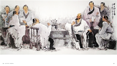 中国画有一大特点,就是兴之所发,一挥而就,堪称世界上速度最快的绘画品种。这种方法便于表现作画家的性情和刹那间的趣味,但同时也可能成为草率多而凝重少、有韵味而少思想的弱点。刘运良的《东坡魂》抛弃了即兴式的抒情,将学术思维运用到国画艺术创作之中,用西画严谨的态度创作中国画。此前刘运良曾经出版过系列油画《石之魂》,如果说《石之魂》是将共时的散乱空间拿来组合系列画面的话,那么《东坡魂》则是通过历时序列画面来组合长篇故事,却完全不同于连环画。这个系列的创作难度是非常大的,因为它们的主角只有一个,每个画面上的“这一个”又要各具姿态。刘运良在东坡题材国画的创作方法上实验了一次创新。我在他的画室内观赏《东坡魂》作品的时候,偶然发现他的创作草稿,令我兴奋不已。也许大部分人不会留意这个速写本,然而正是这个速写本见证了刘运良东坡魂创作的认真程度。《东坡魂》绝大部分都是使用四尺宣纸纵向构图,少数使用八尺大宣横向展开,有像《上元夜》、《送别》这样阔大场面的展开,也有像《晨起理发》、《午窗坐睡》这样生活细节的刻画,而所有国画成品的背后劳动,我们都可以在速写本上找到痕迹。他在创作每一件作品之前都进行了严肃的构思和试制,难怪我们从成品中感觉不到国画通常的率意习气,让人感受到作者是在一丝不苟地描绘着大文豪的这段人生。