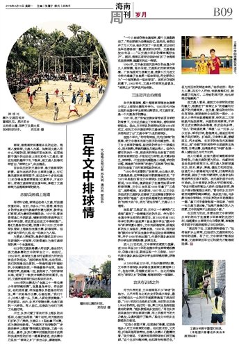 80岁的文昌东阁镇人符史联,是当时代表文昌参赛的文中的学生之一。他回忆,1950年代,排球在文昌农村逐渐成为村民自娱自乐的活动。“那时候没有球,也没有网。我们的球是自己做的,一种是用椰子叶编织的,中间塞些东西;一种是拿柚子当球。竖起两根竹竿,把麻绳一拉,就有网了。”农村排球兴起,培育了一批技术娴熟的民间高手;当时,文昌民间排球已经出现快攻战术。