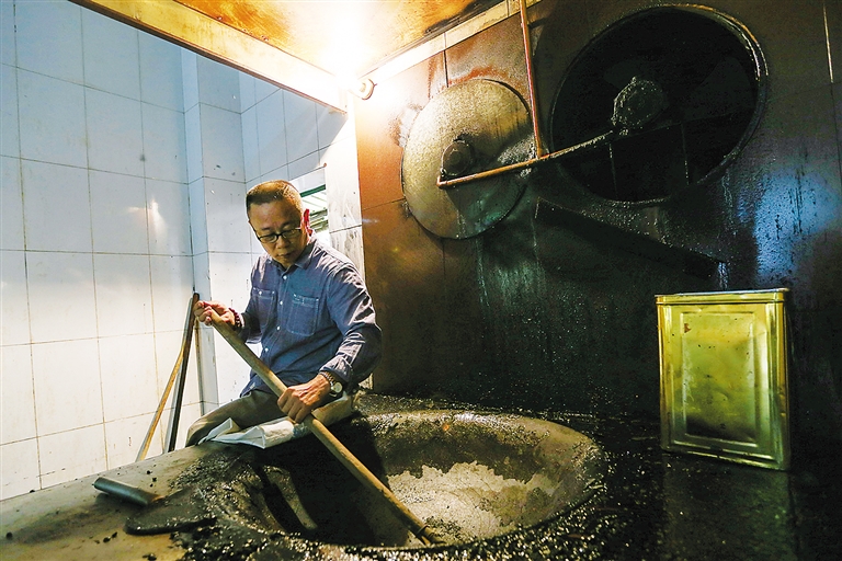 在力度和手法的共同作用下,咖啡豆颜色加深,逐渐膨胀,溢出香气。这时,就要用耳朵听了。“咖啡豆会发出细碎的爆裂声,这告诉我们,加料的时候到了。”在黄来乡看来,翻糖是咖啡炒制过程中最重要的3分钟。稍稍添柴加火,迅速加入白砂糖、人造奶油等继续不停翻炒。若炒得时间不够,咖啡口味会略酸,若时间过长,咖啡不仅失去了色泽,口味也会发苦。何时起锅,则全靠师傅的经验,“唯手熟尔”。