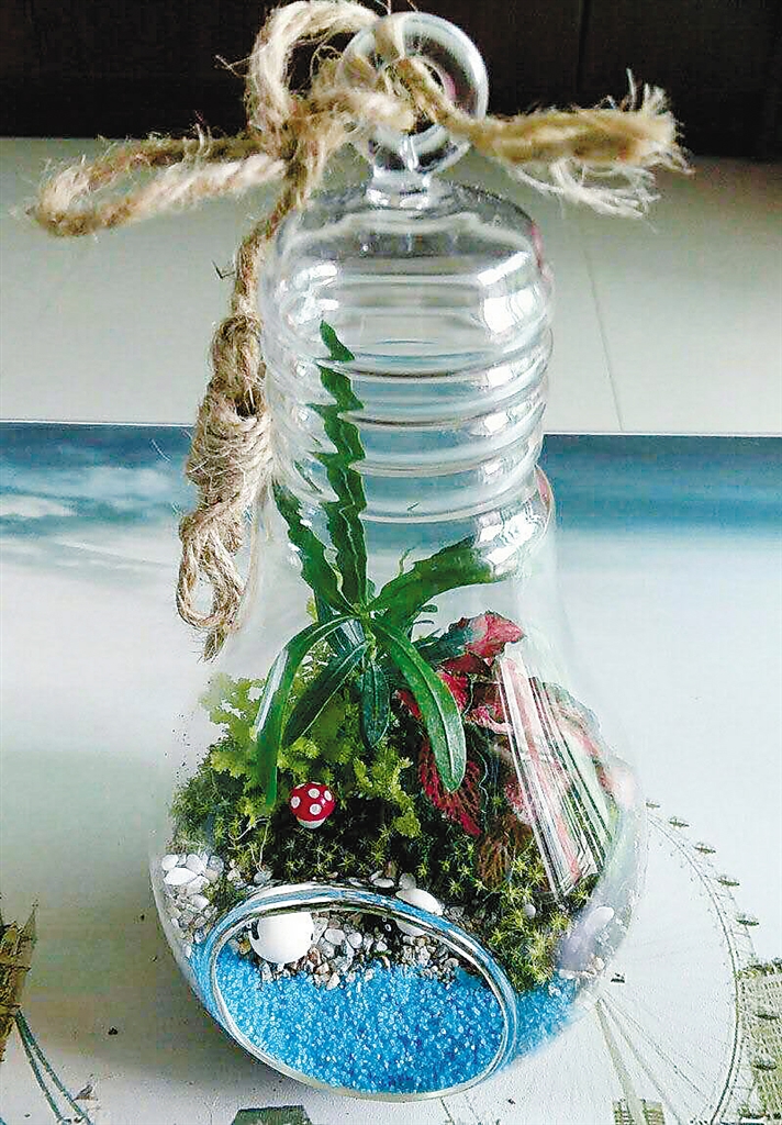 如今,她已基本能熟练制作一般的微景观。记者见到她时,她手中正拿着一盆微景观,直径约有20厘米左右。“这算是比较大的,小点的微景观直径也就10厘米左右,创作不拘一格,随心所欲,关键在于创造和谐与美感。”李俏梅腼腆地笑着。