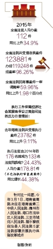 然而,去年海南法院共受理执行案件23782件,同比上升9.11%;执行法官由2014年的176名缩减为133名,法官员额减少24.43%,人均办案178.81件(不包括执行审查类案件),同比增长44.38%,执行工作保障经济社会发展、确保公正高效司法的压力日益增加。