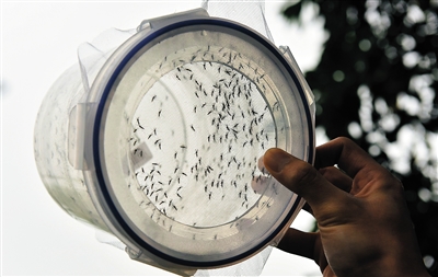 3月16日拍摄的即将被释放到野外的雄蚊。 当日,记者随国际知名专家学者一起探访了广州中山大学奚志勇教授团队建立的世界最大“蚊子实验室”和“绝育蚊子工厂”。该工厂的种群压制灭蚊技术,被看好将来运用于寨卡、登革热防控当中,受到世界各国专家学者的高度关注。