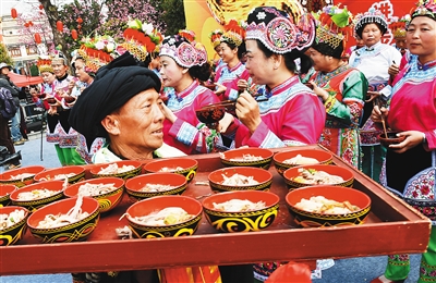 3月16日,工作人员现场将做好的耙肉饵丝分发给人们品尝。 当日,正在云南省巍山彝族回族自治县南诏古镇举行的中华彝族祭祖节暨第六届中国大理巍山小吃节上,“中国最大一碗粑肉饵丝”申报上海大世界基尼斯纪录现场认证成功。制作这碗耙肉饵丝使用饵丝460两、汤肉840两,总计共1300两,可供800人同时食用。