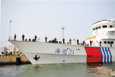 3月19日上午,博鳌亚洲论坛2016年年会及“澜湄会议”水上交通安全保障誓师仪式在清澜港码头举行。预计会议期间将投入执法力量超1000人次。图为“海巡21”轮从清澜码头开赴博鳌。本报记者 周晓梦 邵长春 宋国强 通讯员 何志成 欧阳斐斐 摄