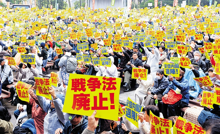 3月19日,在日本首都东京,人们在集会上高举标语。当日,上千名日本民众在东京日比谷公园举行集会和游行,反对安倍内阁本月底即将实施的安保法案。 新华社记者 马平 摄