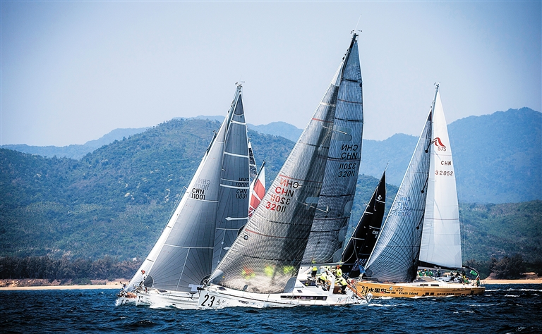 在万宁石梅湾进行的场地赛,“老天爷”很给面子,平均风力12节,阵风近20节,参赛帆船在大风中航行竞逐。天气良好加之观赛方便,石梅湾游艇会码头聚集了不少前来观赛的观众,场面十分热闹。