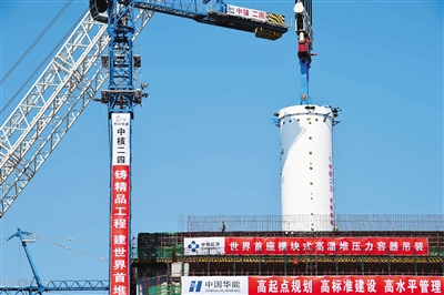 反应堆压力容器是核电站的核心部件之一,是保证反应堆安全运行的重要屏障。本次吊装的压力容器高约25米,重约610吨,是目前世界上制造难度最大、尺寸最大、重量最重的核电站压力容器。