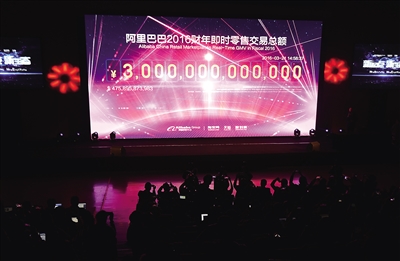 3月21日14时58分,阿里巴巴集团2016财年零售交易总额(GMV)突破3万亿元人民币。这意味着,本财年阿里巴巴集团有望超越沃尔玛,成为世界最大零售平台。新华社发