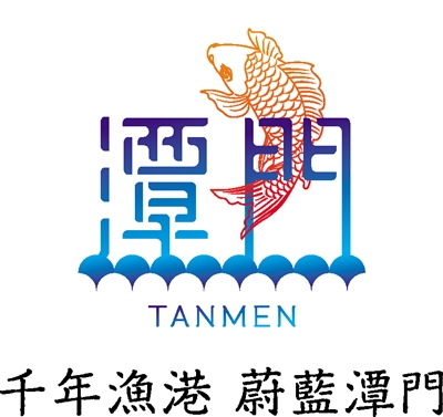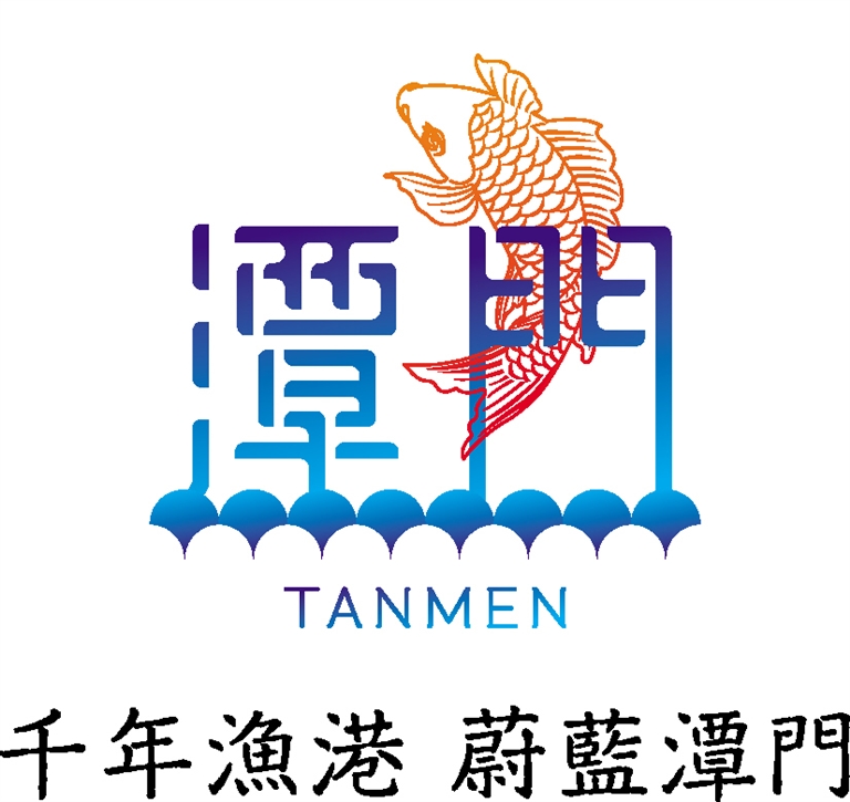 “潭门”两字的字形设计源于沙滩字,搭配由浅到深的蓝色渐变和底部的珍珠海浪,既典雅庄重又富含海洋特色,寓意着潭门悠久的海洋历史文化和灿烂的海洋文明。向上跳跃的“鲤鱼”代表了潭门人民锐意进取、积极向上的精神面貌,展现了潭门人民的生活审美情趣,寓意着潭门人民对美好生活的向往、追求。