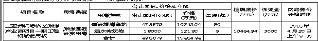 根据国家有关规定,经海南省人民政府批准,海南省海洋与渔业厅决定以挂牌方式公开出让三亚新机场临空旅游产业园项目一期工程海域使用权,现将有关事项公告如下:一、宗海基本情况: