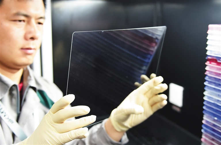 3月22日,科立视材料科技有限公司员工蔡礼貌在做抗菌玻璃产品出货前的检查。 由大陆和台湾科技人员经过2年时间共同研发的抗菌玻璃近日在位于福州经济技术开发区的科立视材料科技有限公司正式投产。该公司生产的抗菌玻璃产品通过离子交换技术在玻璃表面植入多种抗菌离子,可抑制藻类、霉、真菌等的滋生。抗菌玻璃的用途十分广泛,除可用于手机屏幕、电脑屏幕等3C电子触控功能产品外,还可应用于医疗照护、汽车触控、建筑等多种领域。新华社发