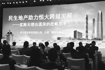 恒大集团副主席、总裁夏海钧在会上发表了《民生地产助力恒大跨越发展》的主题演讲,阐述了实施无理由退房的战略思考,反响热烈。夏海钧表示,坚持民生理念,为老百姓提供高性价比的产品,是公司跨越发展的关键。而实施无理由退房,进一步深化民生理念,则是推动恒大继续跨越发展的重要驱动力。会上,夏海钧更倡议更多同行加入无理由退房阵营,共同促进行业的健康发展。
