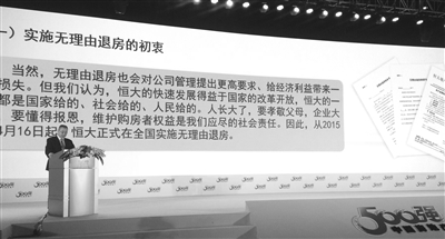 据了解,为践行恒大民生地产的经营理念,体现恒大诚信和恒大住宅品质,维护购房者的权益和市场的良性发展,恒大从2015年4月16日正式实施无理由退房,覆盖恒大所有楼盘住宅。发布会现场,恒大集团副总裁何妙玲介绍了实施无理由退房一年来的情况。她表示,无理由退房的成功实施,是恒大高品质、高性价比产品的又一次检验。恒大去年累计销售2013.4亿,销售面积2551.2万平方米,均创历史新高,而退房率仅为0.91%,充分说明了恒大产品的高品质与高性价比,这也是恒大实施无理由退房的底气所在。