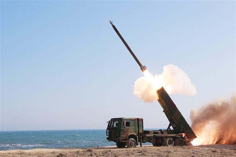 朝中社3月22日提供的照片显示,朝鲜军队试射新型大口径多管火箭炮。 据朝中社22日报道,朝鲜最高领导人金正恩日前再次指导军队试射新型大口径多管火箭炮。报道称,这是实战部署“将韩国作战地点内主要打击对象置于射程内”的大口径火箭炮前所进行的最终试验射击。 新华社/朝中社