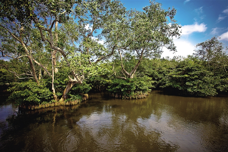 遥望清澜大桥横跨天堑,口袋状的八门湾是世世代代文昌渔民天然的避风港,与普通港湾的白沙绿水不同,八门湾沿岸都被有“海上森林公园”美称的红树林所覆盖,习惯了沙滩,这样的海滨又会是另一番体验。