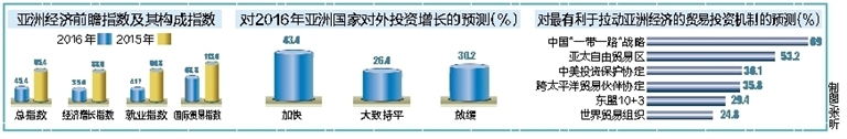 亚洲经济前瞻指数由亚洲经济增长指数、亚洲就业指数和亚洲国际贸易指数构成。亚洲经济前瞻指数的取值范围在“0-200”之间,100为经济增长放缓和加快的临界值。调查结果显示,2016年亚洲经济前瞻指数为45.4,比上年的95.4大幅下降。受访者预期,与2015年相比,2016年亚洲经济总体将呈现进一步走弱趋势。