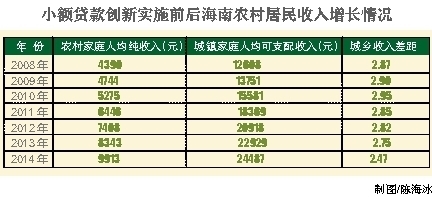 数据显示,1998年-2008年,即海南省农信社开展小额贷款创新前的10年间,海南农村居民收入增速仅为8.43%,低于全省城镇居民收入增速和全国农村居民收入增速;2009年-2014年,即海南省农信社实施小额贷款创新后的5年,海南农民收入实现了两位数增长,增速达到15.88%,超过了海南城镇居民和全国农村居民收入增速。