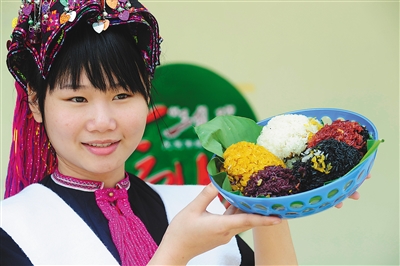 由5种颜色组成,分别为红、黄、紫、白、黑五色,用当地特有的植物汁液浸泡山兰糯米,再由特制的木甑蒸制而成。