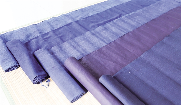 “崖州布所用染料一般都提取自植物和有色矿物,常见的有黑、黑蓝、淡蓝、深蓝、草绿、天青、淡青、粉红、大红等很多种颜色。”周长征指着这些布料说,不少植物染料本身就是民间中药,如染料靛蓝使用的大青叶,就具有消炎祛湿的功效。因此,民间历来都有“土布能养身”的说法。由于布色是手工染制,所以这里没有两匹布的颜色完全一致,每匹都是独一无二的。
