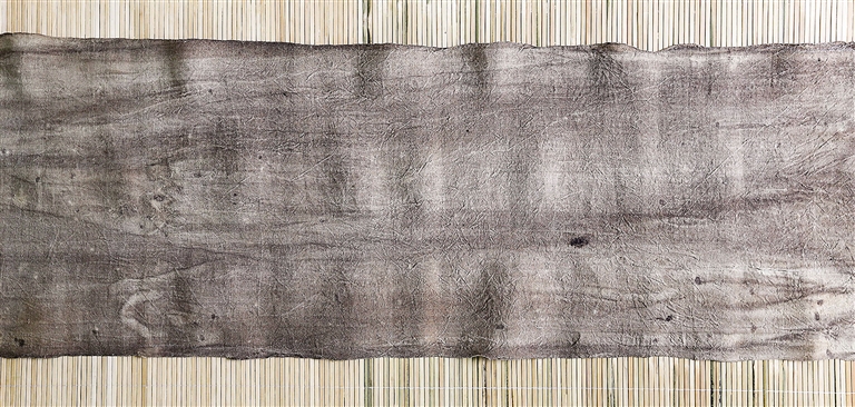 值得一说的是,周长征的崖州布里,有一匹颜色独一无二的崖州布。这一匹布呈暗褐色,手感有些硬。周长征介绍,这是用猪血固色后的半成品,“以前有的人家染布是在染色后再通过染媒固色,猪血或者牛皮煮的水,都有助于增强染色效果。”