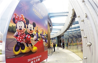 3月28日,位于上海浦东陆家嘴的迪士尼商品官方旗舰店外立着迪士尼度假区即将开幕的广告牌。 当日,上海迪士尼乐园开始向公众发售门票,门票分为平日票和高峰日票两种,平日票370元,高峰日票499元。据悉,上海迪士尼度假区将于6月16日开幕。 新华社记者 方喆 摄