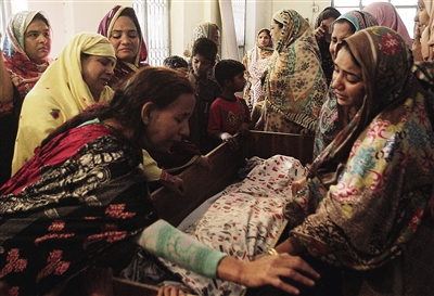 3月28日,在巴基斯坦拉合尔,自杀式袭击遇难者家属悲痛不已。 巴基斯坦东部城市拉合尔一个公园27日遭到爆炸袭击,迄今已造成至少69人死亡,300余人受伤。死伤者多为妇女儿童。新华社/路透