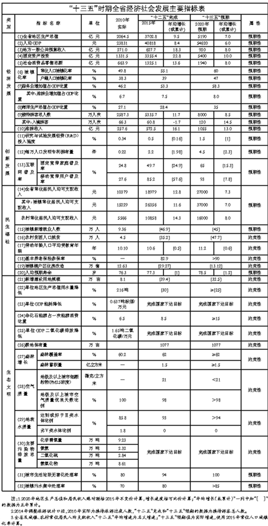 ——经济增长质量和效益显著提高。在提高发展平衡性、包容性、可持续性基础上,主动适应和引领经济发展新常态,保持经济中高速增长。全省地区生产总值年均增长7%,到2020年实现地区生产总值和城乡居民收入比2010年翻一番以上。结构调整取得积极进展,着力提升服务业比重,农业现代化取得明显进展,三次产业比重趋近20:20:60。消费对经济增长贡献明显提高,社会消费品零售总额年均增长8%;固定资产投资年均增长10%;地方一般公共预算收入年均增长8%;常住人口城镇化率提高到60%。