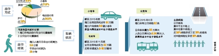 “这是海口史上最细致的交通调查。”海口交通联席办相关负责人说。根据调查,海口常住人口人均每天出行2.69次,其中通勤次数为1.14次。在常住人口出行方式结构中,小客车占21.8%,电动自行车占34.9%,步行占28%;而公交车仅占9.6%。与其他国内城市比较,海口市电动自行车出行比重偏高,公交出行比重偏低。海口人每天平均出行距离为3.6公里,平均出行时耗为24分钟。小客车平均出行效率为16.5公里/小时,公交出行效率11公里/小时,电动自行车平均出行效率11公里/小时。