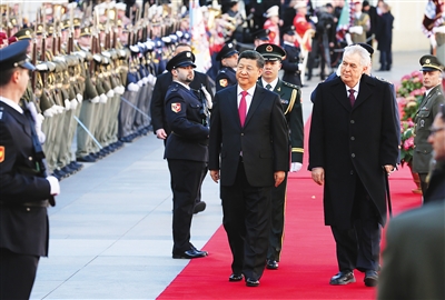 当地时间上午10时许,习近平抵达总统府3号院。旗手沿红地毯整装列队。泽曼在军乐队前迎接习近平。两国元首面向总统旗站立,军乐队奏中捷两国国歌,鸣礼炮21响。习近平在泽曼陪同下检阅仪仗队,仪仗队由捷克军队和总统府警卫部队组成。