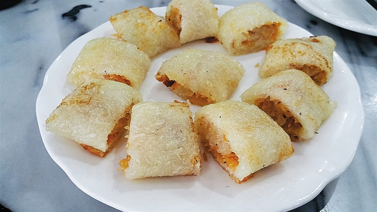 在海南,木薯饼主要流传于海口、定安、屯昌等地。“来份木薯饼”、“打包两份木薯饼带走”……近日,记者在屯昌屯城的餐饮店看到,木薯饼非常畅销,很多人吃饭时必然要点上一份。