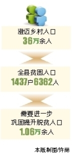 澄迈县委书记杨思涛看着“数字”,并没有松一口气。杨思涛坦言,每年看到经济增长的同时,澄迈也要清醒地看到一个现实:澄迈既是一个工业大县,也是一个农业大县。澄迈依然有乡村人口36万余人,2015年11月,县里成立了16个调查小组,联合省里下派的调查组,用一个月时间,进村入户全面摸底,初步摸清了全县贫困人口基本情况:有贫困人口1437户、6362人,需要进一步巩固提升脱贫人口1.06万余人。