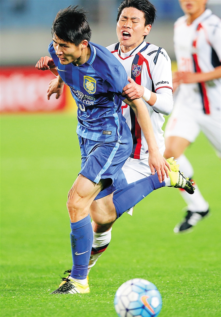 4月6日,在江苏省南京市举行的2016年亚洲冠军杯赛的一场比赛中,江苏苏宁队主场对阵东京FC队。 图为江苏苏宁队球员周云(左)在比赛中防守。 新华社发